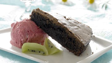 Smelt chokolade og smør i en skål over vandbad og lad det afkøle lidt. Pisk æg og sukker skummende og rør chokoladesmørret i. Tilsæt mel og revet appelsinskal og vend det i dejen. Smør en 26 cm springform og hæld dejen deri. Bag kagen ved 200° i 25-30 min., til kagen er blød og cremet indeni og knasende sprød ovenpå. Lad den afkøle. Blend de frosne hindbær, yoghurt og sukker til en cremet is og server den til kagen sammen med ananaskirsebær eller kiwi.