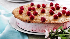 Pisk æggeblommer, vaniljesukker og sukker skummende og pisk fløden til skum. Blend bærrene med mælken, tilsæt æggesnapsen og vend flødeskummet i. Hæld cremen i en 22 cm springform og frys den i mindst 4 timer. Smelt smørret i en gryde, tilsæt marcipan, sukker, hasselnødder, mel, bagepulver, vaniljesukker, sirup og fløde og rør det godt sammen. Hæld dejen ud på en bageplade beklædt med bagepapir og smør den ud i en 20 cm cirkel. Bag nøddelåget ved 200° i 10 min. og lad den køle af. Anret isen på et fad, læg låget over og pynt med friske hindbær.