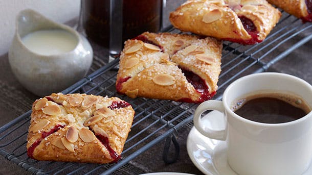 Kom en skefuld tyttebærmarmelade på midten af hvert stykke dej.