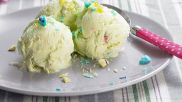 Pisk æggeblommer og sukker til en luftig æggesnaps og pisk hviderne stive. Knus bolsjerne og bland dem i æggesnapsen. Pisk fløden til skum og bland den i æggesnapsen. Vend forsigtigt hviderne i iscremen og kom den i en fryseegnet beholder. Stil isen i fryseren i mindst 3 timer, pynt med knuste bolsjer og server.