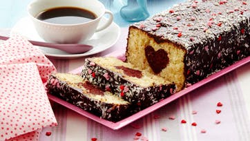 Hjerter: Rør smør og sukker lyst og rør æggene i et ad gangen. Bland mel, bagepulver, kakao og mandelmel og vend det i dejen skiftevis med mælk blandet med frugtfarve. Kom dejen i en smurt sandkageform, bag den ved 170° i 60 min. og lad den køle helt af. Skær kagen i 4 cm tykke skiver og udstik hjerter af dem.