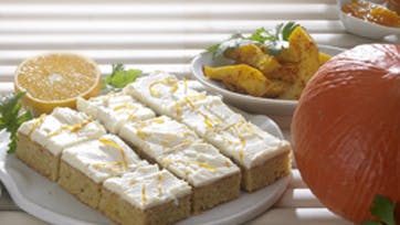 Pynt: Rør friskost, flormelis og appelsinsaft sammen til en blød creme og bred den ud på kagen. Skær den i firkanter og pynt med appelsinskal.