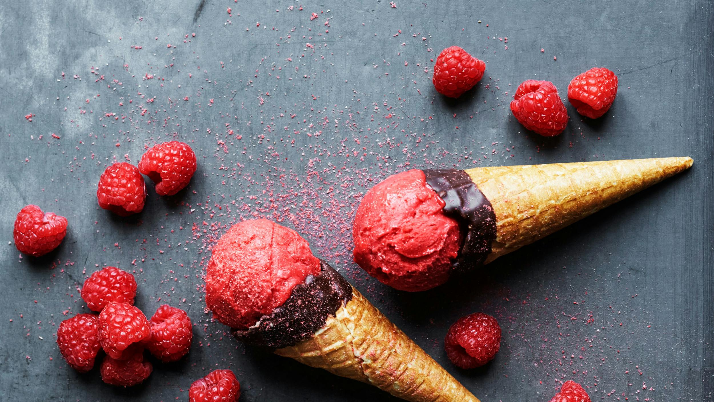 Hak chokoladen groft, og smelt den i et glas over vandbad. Dyp hurtigt vaflerne i chokoladen, og lad den størkne. Fyld kugler af hindbærsorbet i isvaflerne, og servér straks.
