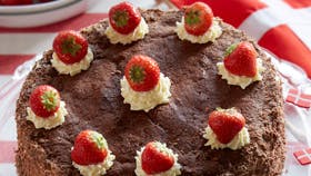 Smelt chokoladen over vandbad. Pisk smør og sukker lyst og rør æggene i. Bland mel og bagepulver og vend det i sammen med den smeltede chokolade. Hæld dejen i en smurt springform på 22 cm og bag kagen i 25 min. ved 200°. Lad den afkøle under et fugtigt viskestykke. Pisk fløden til skum, blend jordbærrene til en glat puré og bland jordbærpuréen med flødeskummen.
