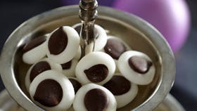 Bland æggehviden med pebermynte-essens, vand og flormelis til en fast masse. Tril massen til kugler og tryk en chokoladeknap ned i hver kugle og lad dem stå i 30 min. Indsendt af: