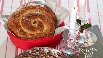 Smuldr smørret i melet. Rør gæren ud i vandet og kom det i melet sammen med æg, kardemomme, rosiner, korender og sukat. Ælt dejen let sammen, den skal helst være lidt fugtig, og lad den hæve lunt tildækket ca. 1 time. Tril dejen til en lang pølse og form den til en snegl på bagepladen. Fold enderne ind under dejen, så de ikke kommer til at stritte under bagningen. Lad sneglen efterhæve lunt ca. ½ time. Pensl med æg og drys med perlesukker. Bag kagen 18-20 min. ved 200° på midterste ovnrille.