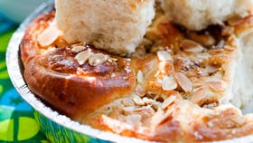 Smelt smørret. Rør mælk og kvark i og rør gæren ud i blandingen. Rør æg, sukker, kardemomme, salt og det meste af melet i og ælt til en smidig dej, tilsæt evt. resten af melet. Lad dejen hæve ca. 30 min. Tag dejen ud på et meldrysset bord og del den i to dele. Rul hver del ud til en firkant på ca. 30 x 40 cm. Fordel smør, sukker, kanel og revet marcipan over dejen og rul sammen til en roulade. Skær hver rulle i 12 stk. og sæt dem i en beklædt form (ca. 25 x 35 cm) med skærefladen op. Lad dem efterhæve tildækket i ca. 30 min. Pensl dem med sammenpisket æg og drys med sukker og mandelflager. Bag kagen nederst i ovnen ved 175º i ca. 20 min. og lad den afkøle.