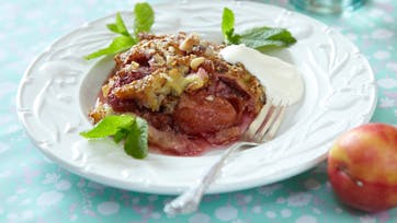 Halvér og udsten blommerne. Kog dem i vand og sukker i 2 min. Læg blommerne, med ganske lidt af lagen, i et smurt, ildfast fad. Hak mandlerne. Pisk æg og sukker luftigt. Bring fløde, vaniljekorn og den flækkede vaniljestang i kog. Legér æggemassen med fløden, der hældes gennem en sigte. Hæld cremen over blommerne og drys med mandlerne. Bag kagen ved 170° i 45 min. Afkøl og server med is eller cremefraiche.