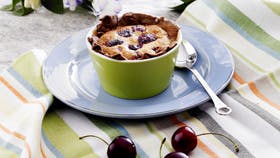 Bland mel, flormelis og kakao og smuldr smørret heri. Saml dejen med æggeblommen og lad den hvile koldt i mindst 30 min. Rul dejen ud og beklæd 6 smurte kokotter med dejen. Fyld de beklædte forme halvt op med bærrene. Pisk æg, sukker og vanilje skummende og rør fløden i. Hæld æggeblandingen over kirsebærrene og drys mandelsplitterne over. Bag kokotterne ved 180° i 25 min., til cremen er stivnet, og server.