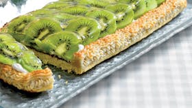 Hak mel, sukker og smør til en grynet masse. Saml dejen med cremefraichen og rul den ud på et stykke bagepapir til en firkant på 12 x 25 cm. Rør marcipanen med sukker og æggehvide til en blød kransekagemasse. Kom massen i en sprøjtepose og sprøjt den ud som kant på mørdejsbunden. Prik tærten og bag den i 15 min. ved 200°. Drys bunden med chokolade og lad den afkøle på en rist. Sæt husblassen i blød i 5 min., smelt den og rør den i hvidvinen. Hæld vinen i en rugbrødsform beklædt med husholdningsfilm og lad den stivne på køl. Riv marcipanen og bland den i kvarken. Skræl kiwierne og skær dem i skiver. Fordel kvarkcreme og kiwiskiver over mørdejsbunden og læg vingeléen over.