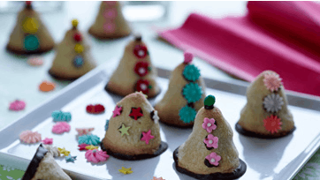 Bland mel og flormelis sammen i en skål. Hak smørret ud i melblandingen, tilsæt vand og saml dejen. Stil dejen koldt i 30 min. Del marcipanen i 12 stykker og tril dem til kegler. Del dejen i 3 og rul hver del ud til en 10 cm stor cirkel. Del hver cirkel i 4 stykker og fold dejstykkerne om marcipankeglerne, så de er helt dækket. Klem samlingerne sammen. Stil keglerne på en plade beklædt med bagepapir og stil dem koldt i mindst 1 time. Bag hattene ved 215° i 8 min. og lad dem køle helt af. Smelt chokoladen, dyp bunden af hattene i chokolade og dekorér med sukkerkugler sat fast med chokolade.