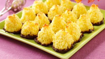Smelt smørret og lad det køle lidt. Bland det med de øvrige ingredienser. Lad dejen køle i ca. 10 min. Sæt toppene på en plade med bagepapir ved hjælp af et par spiseskeer. Bag toppene ved 175° i 8-10 min.