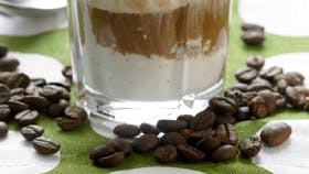 Rist nødderne i ovnen ved 200° i 10 min., gnid den brune skal af med et viskestykke og hak nødderne. Bland vaniljesukkeret i fløden og pisk den til skum. Kom isen i to høje glas og hæld den varme kaffe over. Kom flødeskummet over, drys med nødder og server straks.