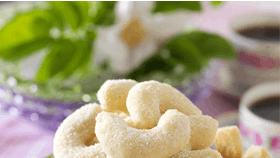 Bland alle ingredienserne til en smidig dej, evt. på foodprocessor. Del dejen i 4 dele og rul dem ud i fingertykke stænger. Skær dem i 6-7 cm lange stk. Form dem til horn og læg dem på en plade med bagepapir. Bag dem midt i ovnen ved 175º i ca. 12 min. Vend kagerne i sukker, mens de endnu er varme.