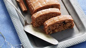 Rør smør og sukker sammen og pisk ægget i. Bland mel, kanel, nelliker, vanilje og bagepulver og rør det i dejen skiftevis med hvidtøllen. Vend sukat, rosiner og hakkede valnødder i dejen og hæld den i en smurt sandkageform. Bag kagen ved 160° i 60 min. og lad den afkøle. Rør flormelis og citronsaft sammen, tag ¼ fra og kom den i en lille frysepose. Rør kanel i resten af glasuren og kom den over kagen. Klip et lille hul i fryseposen og sæt streger på tværs af kagen med den hvide glasur. Træk en tandstik gennem den våde glasur for at lave et fint mønster. Lad glasuren tørre og servér.