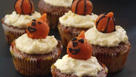 Bland alt det tørre i én skål og alt det våde i en anden. Bland begge dele med revet græskar og hakkede nødder. Kom i muffinsforme og bag ved 200° i 15-20 min. Pisk smør, ost, flormelis, kanel og vanilje sammen og smør det på de afkølede muffins. Farv marcipanen orange og form små bolde på størrelse med valnødder. Lav linjer og stilk som var det græskar og sæt mønstre på til græskarmænd.
