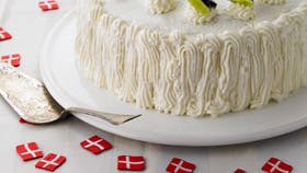 Pisk æg og sukker luftigt og vend sigtet mel, kartoffelmel og bagepulver i dejen sammen med mandlerne. Hæld dejen i en smurt 24 cm springform og bag kagen nederst i ovnen ved 175° i 40 min. Lad kagen køle helt af og del den i tre bunde. Pisk æg, sukker, majsstivelse og kornene fra vaniljestangen sammen i en gryde og rør mælken i. Varm cremen igennem under omrøring til den tykner og stil den til afkøling. Læg lagkagen sammen med marmelade, creme og frugt mellem bundene og pisk fløden til skum. Pynt lagkagen med flødeskum og frugt og server.