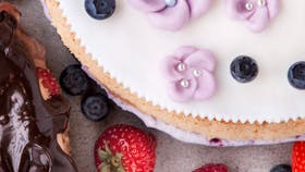 Varm blåbær og sukker op og lad det koge nogle min., til blandingen tykner, og lad den køle af. Pisk fløden, gem ¼ til senere. Rør mascarpone og vaniljesukker i fløden, rør blåbærrene i og rør forsigtigt til en jævn masse. Læg kagen sammen med blåbær-flødecremen. Rul fondanten tyndt ud på et bord drysset med flormelis og udstik en cirkel evt. efter bageformen. Fordel den lille portion fløde på toppen af kagen og læg fondantcirklen oven på. Farv det overskydende fondant lilla med den røde og blå frugtfarve. Tril fondanten til små kugler og form dem til blade med en ske. Saml 4-5 blade til en blomst og læg et par sukkerkugler i hver blomst. Pynt kagen med blomster og blåbær.