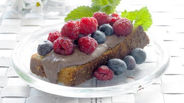 Chokoladecreme: Hak chokoladen. Kog fløden op i en gryde og hæld den over chokoladen. Rør, til chokoladen er smeltet. Stil cremen en times tid i køleskab og pisk den let igennem. Skær kagen i skiver, læg chokoladecreme på og fordel rigeligt med bær og lidt citronmelisse.
