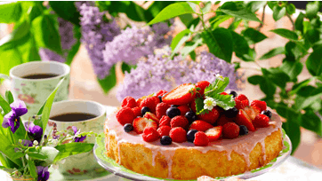 Bland flormelis, frugtfarve og vand til en jævn glasur og pynt kagen med den. Kom bærrene over lige inden servering.