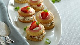 Rør en glasur af 1 tsk. saft fra rabarberne og flormelissen og dekorér halvdelen af mørdejskagerne. Læg mørdejsbundene sammen to og to med en skefuld jordbær-rabarberkompot og en klat nougatskum. Pynt kagerne med jordbær og servér.