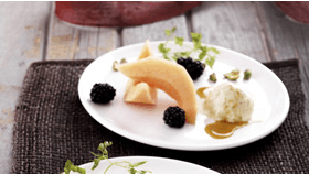 Melonen skæres i både. Appelsinsaft og honning koges sammen, og frugten trækker i dette. Serveres med kugler af is, sirupssovs og totter af kørvel.