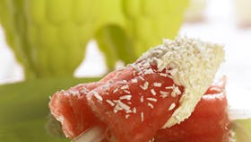 Befri melonen for kerner og blend den med grenadine. Hæld blandingen i pindeisforme og sæt pinde i. Lad isene fryse i mindst 3 timer, til de er helt frosne. Smelt chokoladen og hæld kokossen i en dyb tallerken. Dyp isene i chokoladen, vend dem i kokos og server. De dyppede is kan pakkes i smørrebrødspapir og lægges tilbage i fryseren.