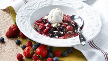 Skyl og nip de bær, der kræver det, og skær evt. jordbærrene i mindre stykker. Fordel dem i et ildfast fad og dryp med citronsaft, lidt revet skal og sukker samt evt. lidt lakridspulver. Hak den hvide chokolade meget fint og drys den over bærrene, der sættes 10 min. i ovnen ved 200°, lige inden, de skal spises. Serveres med kugler af vaniljeis.