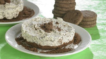 Knus kagerne (gem lidt) og pres dem i 4 små portionsspringforme. Rør isen med hakket chokolade, små stykker banan og vaniljeessensen. Kom over smuldrebundene og stil i fryseren. Server med knuste kager som pynt eller hakket chokolade over.