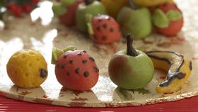 Del marcipanen i fire dele. Ælt en farve i hver af de tre portioner og behold den sidste neutral. Form jordbær, æbler, appelsiner og bananer af marcipanen - alt i miniaturestørrelse. Og brug bare fantasien, der kan laves mange forskellige, sjove frugter. Pyntes med streger eller toppe af smeltet chokolade.