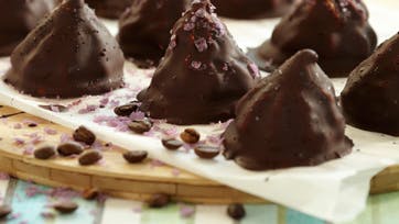 Rør kaffen ud i vandet. Bland 1 tsk. kaffe med marcipan og flormelis og ælt det godt sammen. Rul marcipanen ud i 2 mm's tykkelse, udstik små cirkler med en 4 cm udstikker og bag dem ved 200° i 8 min. Udblød husblassen og smelt den med det vand, der hænger ved. Pisk hviderne stive med resten af kaffen og flormelis og tilsæt husblassen, mens der piskes. Kom hviderne i en sprøjtepose, sæt en top på hver af de afkølede bunde og stil dem i fryseren. Smelt chokoladen over vandbad og overtræk flødebollerne ved at dyppe dem i chokoladen, pynt evt. med lidt smeltet, hvid chokolade og lad dem tørre på et stk. bagepapir.