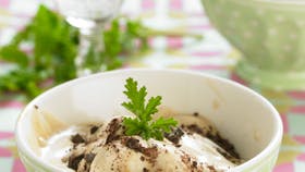 Tip: Når kaffe-æggeblandingen piskes dagen før og stilles koldt, bliver det helt cremet. Vend så flødeskummet i og sæt det i fryseren 2-3 timer.