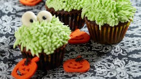 Pisk æg og sukker luftigt, smelt smørret og pisk det i. Bland vanilje, natron, kakao og mel og rør det i sammen med fløden. Kom dejen i 12 muffins-forme, bag dem ved 180° i 25-30 min. og lad dem køle helt af. Pisk flormelis, smør, mælk og vanilje til en glat creme og rør farven i. Kom den farvede creme i en sprøjtepose med en tylle med mange små huller og kom cremen på kagerne. Form fondanten til øjne og sæt dem på kagerne.
