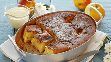 Smelt smørret, rør mælken i og lad det afkøle. Pisk æg og sukker til en let og luftig æggesnaps, rør mel og bagepulver i skiftevis med mælkeblandingen. Fjern kernehusene og skær æblerne i både. Kom dejen i en smurt eller beklædt form på ca. 20 x 30 cm, fordel æblerne over og drys med kanel. Bag kagen midt i ovnen ved 200º i ca. 30 min.