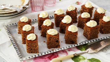 Bland alle de tørre ingredienser. Pisk æggene og rør dem i melblandingen sammen med smørret og rør, til dejen er jævn. Brug evt. en køkkenmaskine, for det er en stor portion. Beklæd en form på ca. 30 x 40 cm med bagepapir og fordel dejen i den. Bag kagen ved 180-200º nederst i ovnen i ca. 30 min. og tjek med en kødnål, om kagen er gennembagt. Lad den køle af på en rist. Skær kagen i bidder og pynt dem evt. med flødeost rørt med vaniljesukker. Dejlig, krydret kage, der holder sig saftig længe, hvis der da bliver noget tilovers, når den først har været på bordet!