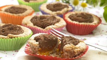 Varm piskefløden op og smelt chokoladen heri. Varm blandingen godt igennem under omrøring og stil den i køleskabet, til den er helt kold. Blend mandlerne og bland dem med flormelis. Pisk hviderne stive, vend mandelblandingen i og fordel dejen i 15 muffinsforme. Skyl og halver abrikoserne og læg en halv abrikos i hver muffinsform. Bag kagerne ved 175° i 15 min. og lad dem køle af. Pisk den kolde chokoladefløde til den begynder at tykne og kom den i en sprøjtepose. Dekorer kagerne med chokoladecremen og server.