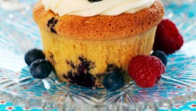 Pisk æg og sukker lyst og luftigt til en æggesnaps. Smelt smørret og rør mælken i. Bland mel og bagepulver og vend det forsigtigt i æggesnapsen skiftevis med smørblandingen. Vend bærrene i til sidst. Fordel dejen i ca. 12 muffinsforme, ca. 3-4 spsk. i hver. Bag kagerne midt i ovnen ved 225º i ca. 15 min. Rør flødeost, smør og sukker til en fyldig topping, fordel den på kagerne og pynt med bærrene.