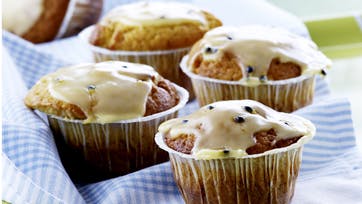 Pisk smør og sukker luftigt. Pisk æggene i et ad gangen og vend mel, kærnemælk, bagepulver og juice i dejen. Rør til dejen er glat. Kom dejen i små muffinsforme og bag ved 180° i 15-20 min. Afkøl og rør glasur sammen af flormelis, citronsaft og frugtkødet fra en passionsfrugt. Smør glasur på kagerne, når de er afkølede, og pak dem evt. i en dåse til at tage med på picnic.