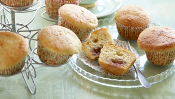 Bland mel, salt, bagepulver og natron og pisk sukker og æg luftigt. Rør mælk og smør i æggesnapsen og bland med melet. Rør dejen godt igennem, til den er glat og uden klumper, og kom halvdelen af dejen i 18 muffinsforme. Kom en teskefuld marmelade i midten af hver form og kom resten af dejen over. Bag dem ved 200° i 20 min.
