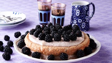 Fyld: Kog sukker og vand, til det er 117°, lige inden det begynder at brune, tages det af varmen. Rør brombær, likør og marmelade sammen og lad det trække. Pisk æggehviderne stive, hæld sukkerlagen i æggehviderne i en tynd stråle, mens der piskes. Når den italienske marengs (sådan hedder det, når man bruger varm sukker i æggehviderne) er sej, piskes smørret i - i små klumper til en glat masse. Vend brombærmassen i marengsmassen og saml kagen med fyldet og stil den køligt. Tag kagen ud ca. 30 min. før servering og pynt med friske brombær.