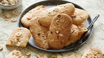 Rør, til dejen er glat. Kom den i en sprøjtepose med tylle og afsæt toppe på plader med bagepapir. Drys med hasselnøddeflager.