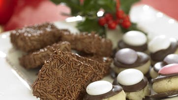 Del nougat i 15 skiver og tryk dem i krymmel. Stil koldt.
