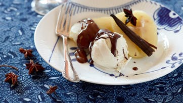 Skræl pærerne, lad evt. stilk og kræmmerhus blive. Kog lagen op, kom pærerne i og kog, til de er let møre - ca. 8 min., tag dem op. Smelt chokolade og fløde sammen over vandbad. Anret pærerne i små assietter med chokoladesovs og vaniljeis.