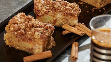 Rør smør med sukker, til det er lyst og luftigt. Tilsæt æggene et ad gangen. Hak nødderne fint og kom dem i dejen. OBS! Nu må der ikke røres mere i dejen, så bliver den brødagtig. Fold forsigtigt mel, bagepulver, kanel og vaniljekorn i dejen og kom den i en lille beklædt bradepande på 20 x 25 cm. Tag pærerne op af kogelagen (der skal gemmes) og læg dem på dejen. Blend ingredienserne til smuldredrysset og hæld det over. Bag kagen ved 160° i 45-60 min., til den slipper en strikkepind. Varm citron-pærelagen op, hæld den over kagen og afkøl.