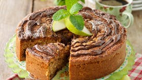 Smelt smørret. Pisk æg, farin og sukker luftigt. Bland mel, vaniljesukker og bagepulver. Rør det i æggeblandingen skiftevis med mælken. Rør det smeltede smør i og vend forsigtigt de hakkede nødder i. Dryp Nutellaen i dejen. Skræl pærerne, skær dem ud i tern og vend dem i dejen. Kom dejen i en springform på ca. 24 cm. Bag kagen nederst i ovnen i ca. 50 min. ved 175º. Pynt kagen med den bløde Nutella.