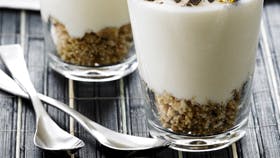 Server moussen pyntet med chokoladespåner og evt. strimler af appelsinskal.