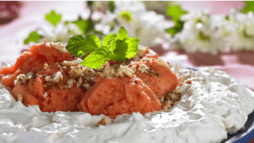 Sorbet smelter hurtigt. For at gøre det nemmere kan bunden fyldes med sorbet en times tid før og sættes i fryser. Sukkerindholdet i marengsbunden er så stort, at den ikke fryser på en time.