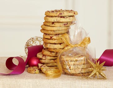 Bland smør, sukker og vanilje til en blød masse. Tilsæt mel, hakkede nødder og bær og saml dejen til en mørdej. Del den i to og tril to pølser på ca. 5 cm i diameter. Læg dem i plastfilm i køleskabet natten over og skær dem i 1 cm tykke skiver. Bag dem ved 180° i 15 min. Afkøl dem på en rist og pak dem i glas eller små dåser.