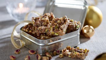 Smør et stykke bagepapir med olie og læg det i et 22 x 33 cm ovnfast fad. Kog sukker og vand op over middelhøj varme og lad det koge i 10-15 min. uden at røre, til karamellen bliver gylden. Tilsæt nødderne og hæld det ud på bagepapiret og lad det køle i et par min., til det er fast, men stadig blødt. Løft bagepapiret med karamelpladen op på et skærebræt og skær det ud i firkanter med en skarp kniv.