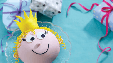 Montér delene på kagen med tyloselime, start med ører, krøllerne og kronen. Hvis kronen ikke er helt tør, kan den understøttes af en sammenfoldet, tør engangsvaskeklud, så den holder faconen.